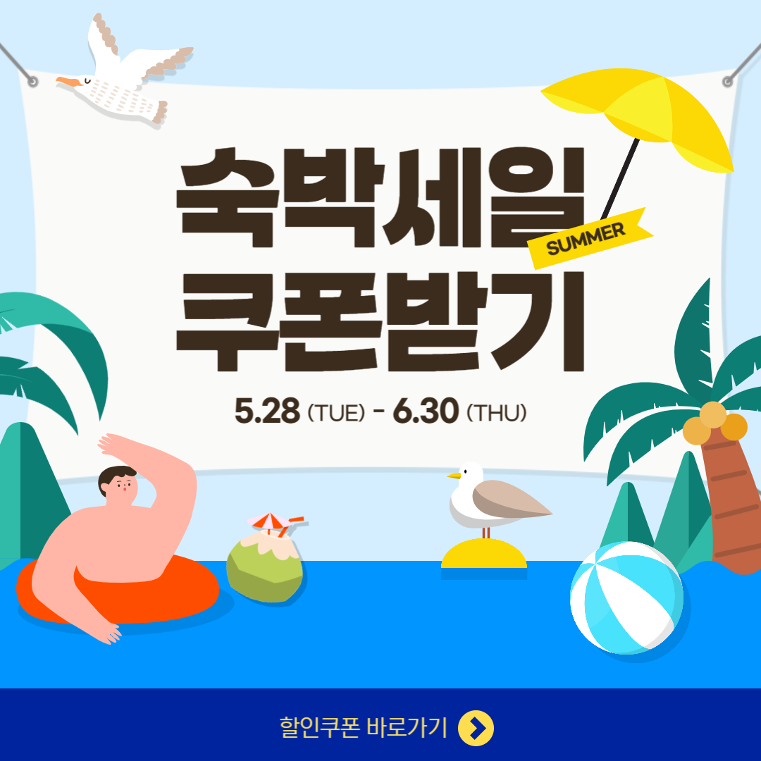 여름휴가의 절정! 6월에 여행을 떠나실 분은 지금 당장 숙박 할인권을 받으셔야 합니다. 전국 총 12개 지역에 국내 여행지라면 할인쿠폰이 사용가능해요.