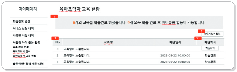 📌 교육방법 : 지원결정 통보 → 만능키 로그인 → 마이페이지 → 서울형 아이 돌봄 활동 → 육아조력자 교육현황 → 학습하기(총 9차시)