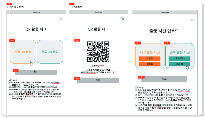 돌봄활동 시작과 종료 시 조력자는 양육자의 QR코드를 스캔해야 합니다. 만약, QR체크가 어려운 경우 아동과 함께 있는 돌봄 활동 사진을 업로드하여 대체할 수 있습니다.
