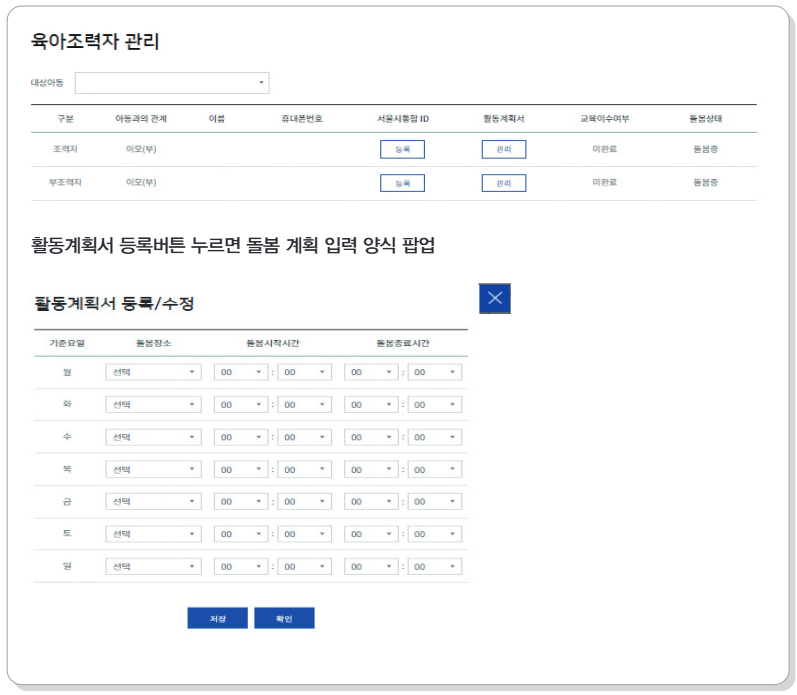 📌 등록방법 : 만능키 로그인 → 마이페이지 → 서울형 아이돌봄 활동 → 육아조력자 관리 → 활동 계획서 등록