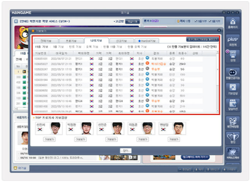 대국에 관련된 모든 기보는 대기실 우측 기보감상 버튼을 클릭하여 확인 가능합니다.