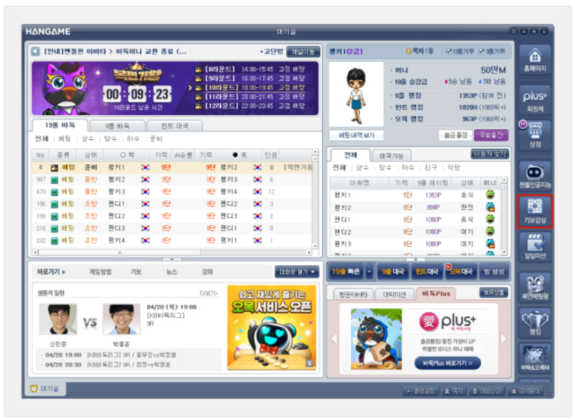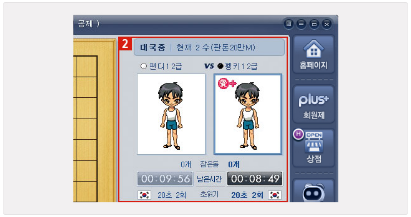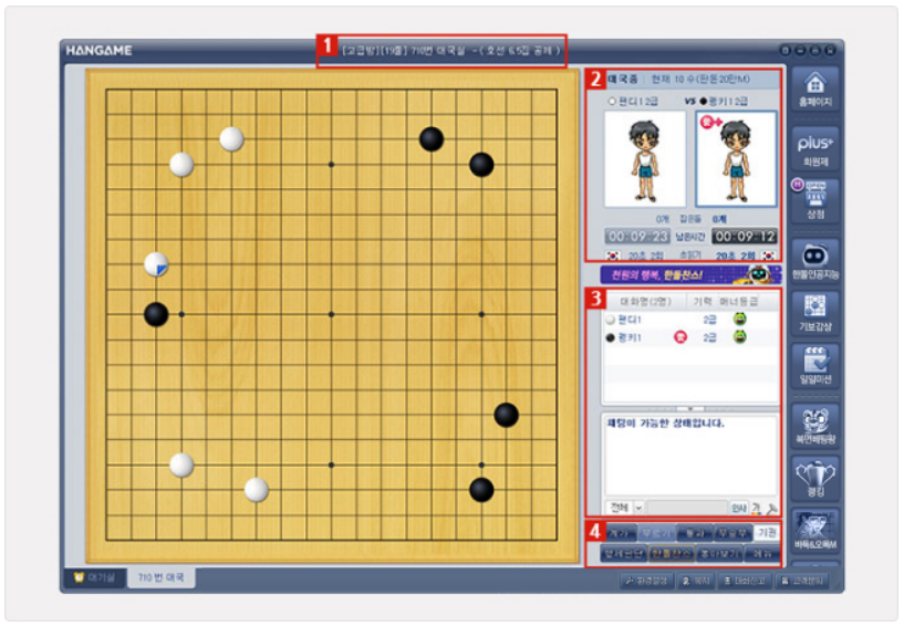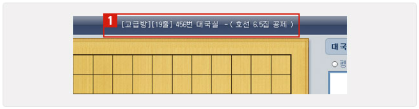 현재 진행수순, 내기대국 판돈, 대국자 대화명, 잡은돌, 남은시간 등의 정보를 확인할 수 있습니다.