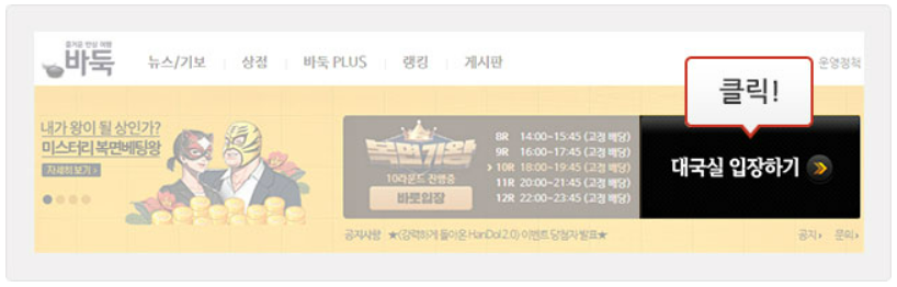 한게임 바둑 대국실 입장방법에 대해 알아보겠습니다. 홈페이지 우측 상단의 '대국실 입장하기' 버튼 클릭 시 게임창이 열립니다.