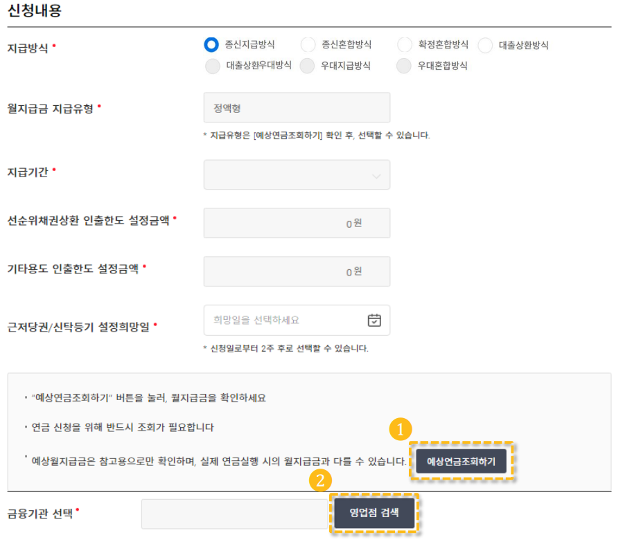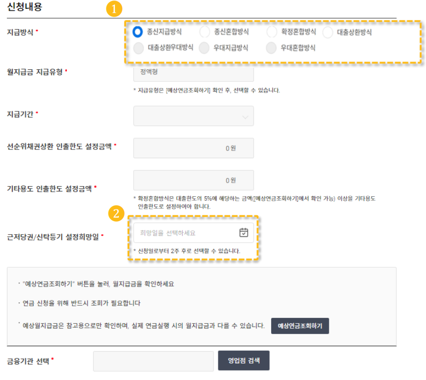 본인 상황에 따른 월지급 방식(종신 방식, 확정기간 방식, 대출상환 방식, 우대 방식)을 선택하고,