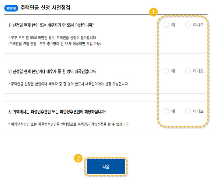 주택 소유자 또는 배우자 중 최소 1명이 기초연금을 수급하고 있어야 합니다.