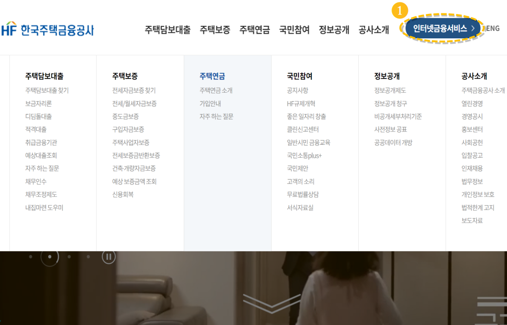 주택연금은 HF 한국주택금융공사 사이트에서 온라인으로 신청할 수 있습니다. 우선, 홈페이지로 이동해 인터넷금융서비스를 클릭하세요.