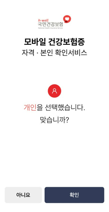 2. 앱을 설치하면 '모바일 건강보험증' 앱에서 아래와 같이 화면에서 '개인입니까?'를 확인 후, 언어를 한국어로 선택하세요.